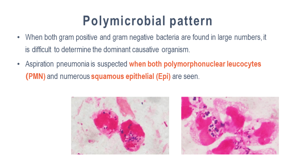 Aspiration pneumonia is suspected when both polymorphonuclear leucocytes (PMN) and numerous squamous epithelial (Epi) are seen.