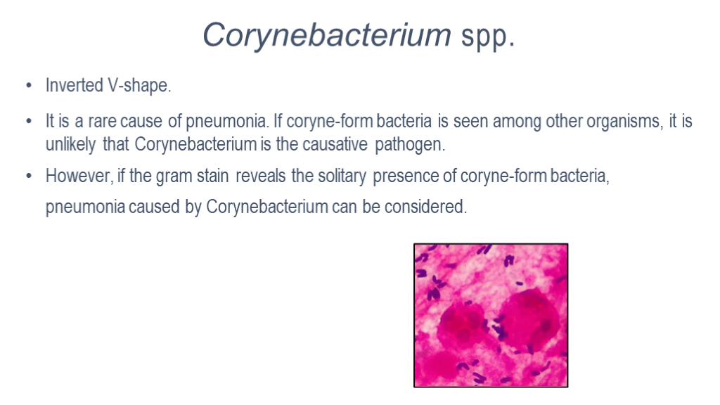 However, if the gram stain reveals the solitary presence of coryne-form bacteria, pneumonia caused by Corynebacterium can be considered.