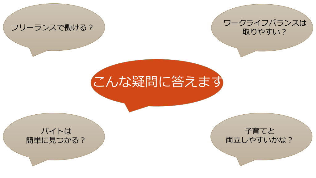 #2. フリーランスで働ける︖ ワークライフバランスは 取りやすい︖ こんな疑問に答えます バイトは 簡単に⾒つかる︖ ⼦育てと 両⽴しやすいかな︖