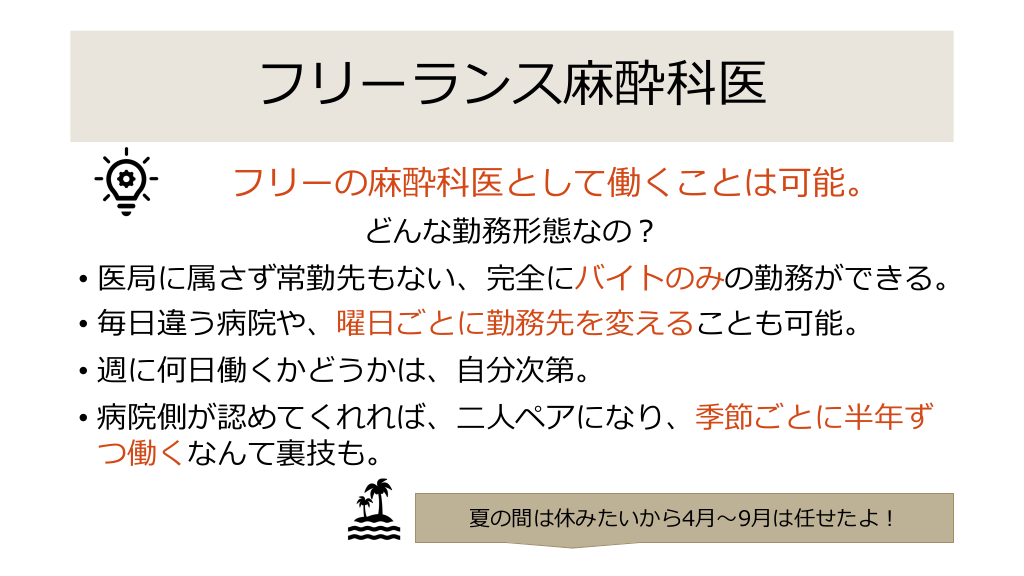 #3. フリーランス⿇酔科医 フリーの⿇酔科医として働くことは可能。 どんな勤務形態なの︖ • 医局に属さず常勤先もない、完全にバイトのみの勤務ができる。 • 毎⽇違う病院や、曜⽇ごとに勤務先を変えることも可能。 • 週に何⽇働くかどうかは、⾃分次第。 • 病院側が認めてくれれば、⼆⼈ペアになり、季節ごとに半年ず つ働くなんて裏技も。 夏の間は休みたいから4⽉〜9⽉は任せたよ︕