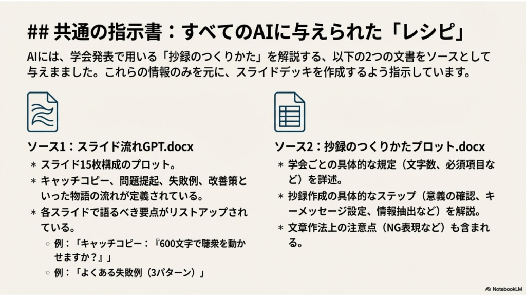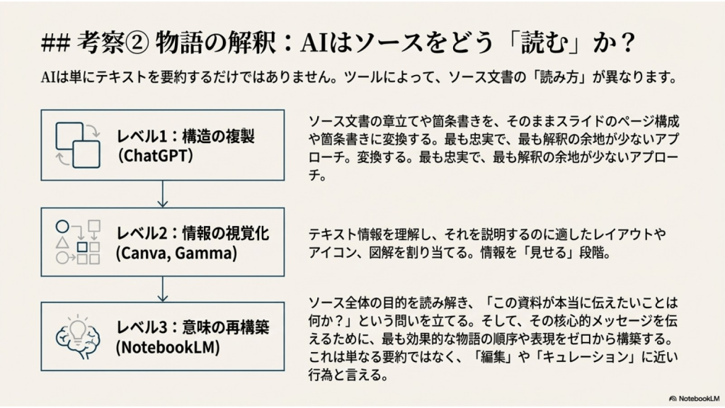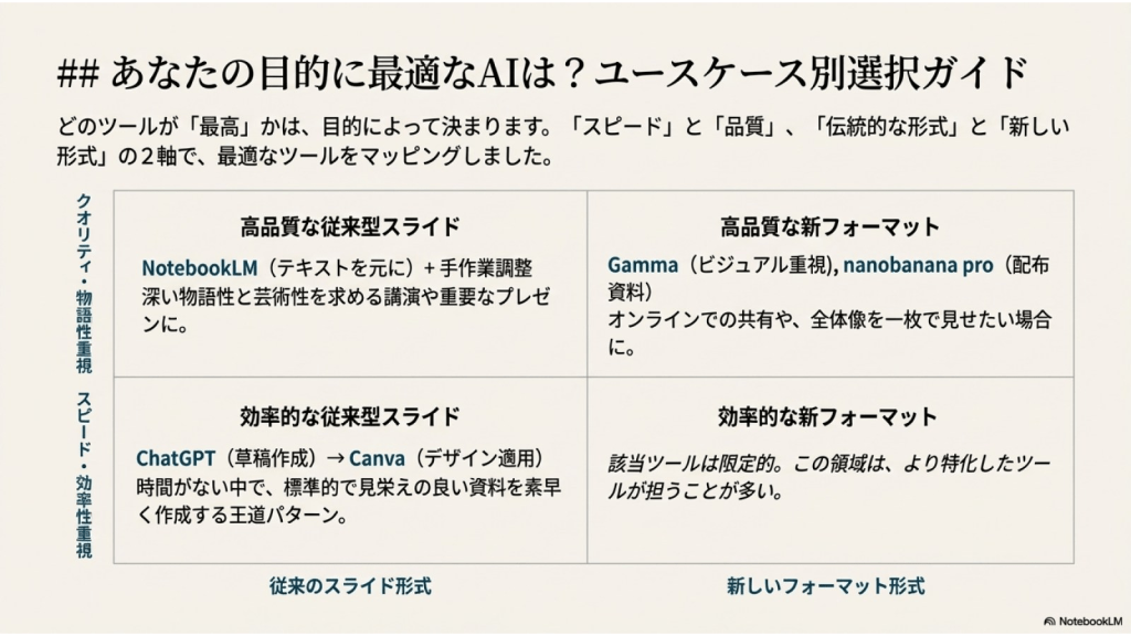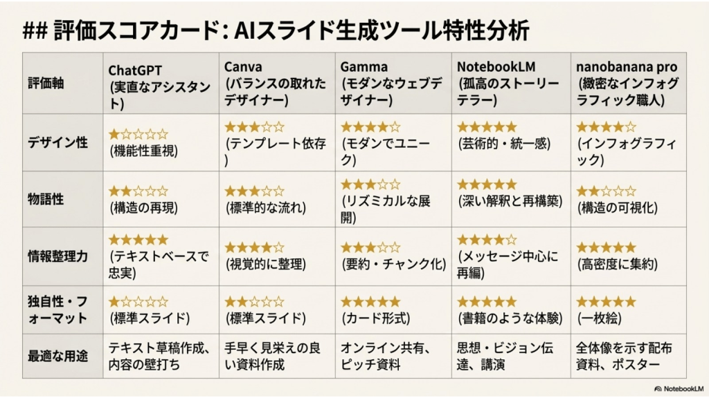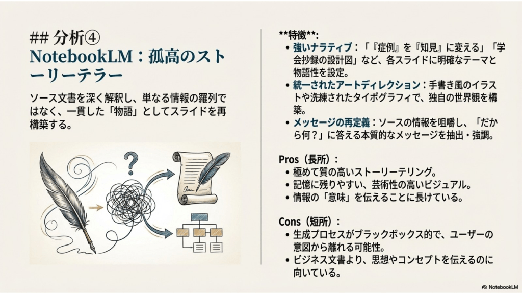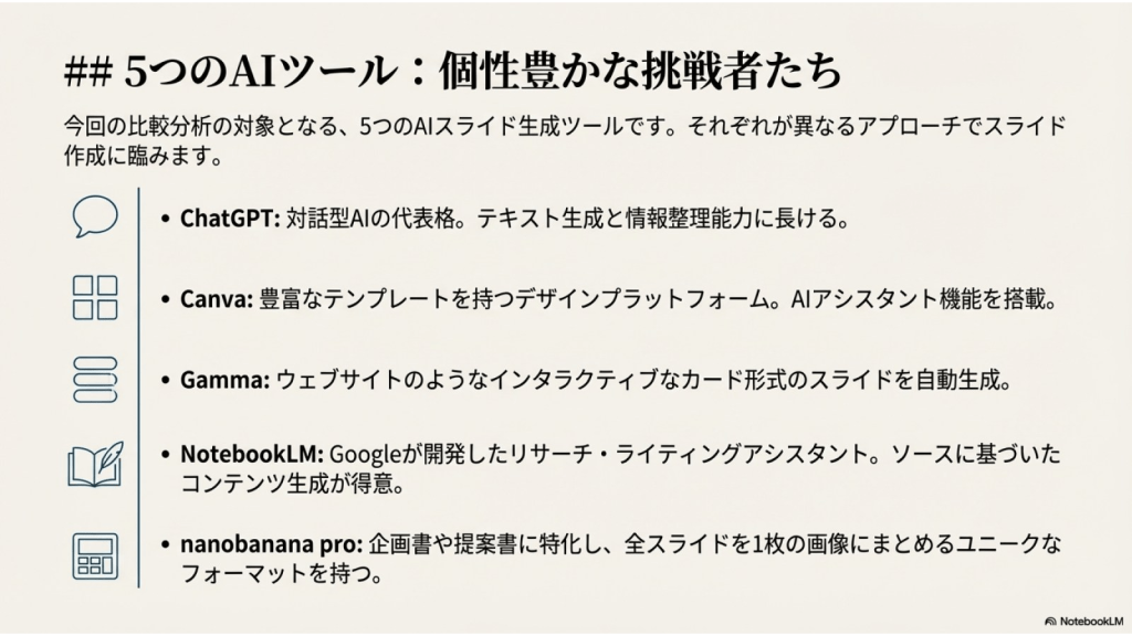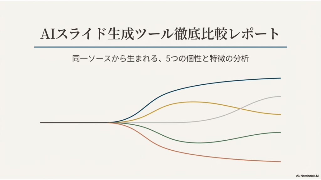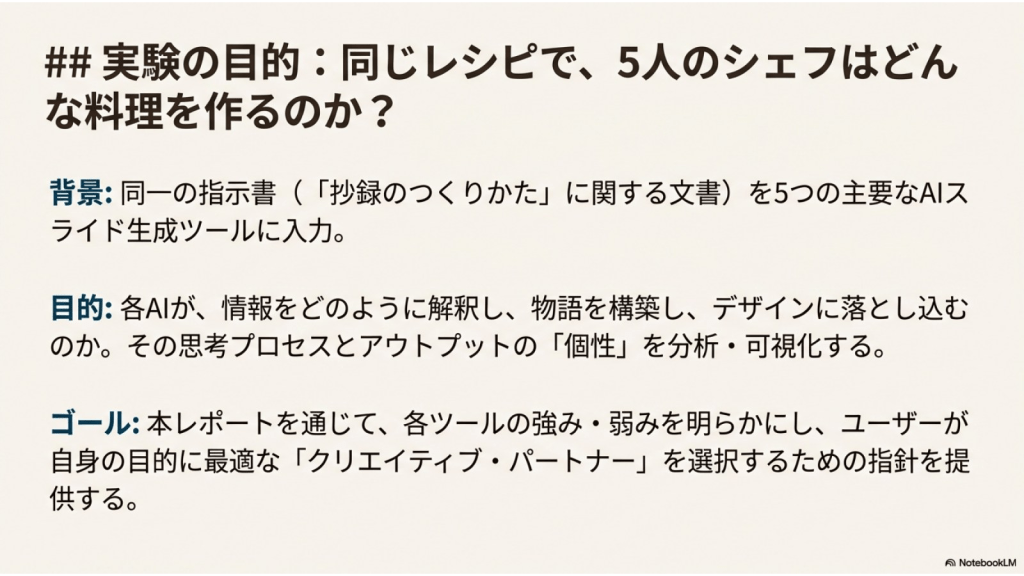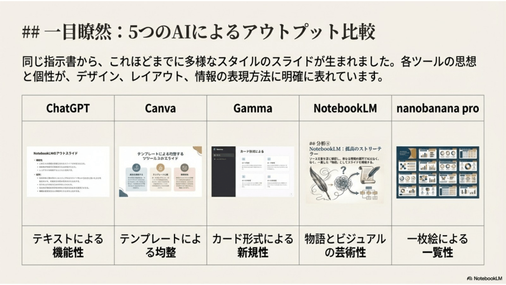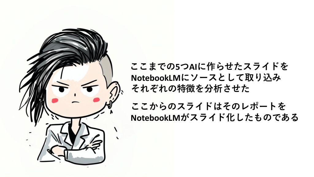 #7. ここまでの5つAIに作らせたスライドを NotebookLMにソースとして取り込み それぞれの特徴を分析させた ここからのスライドはそのレポートを NotebookLMがスライド化したものである