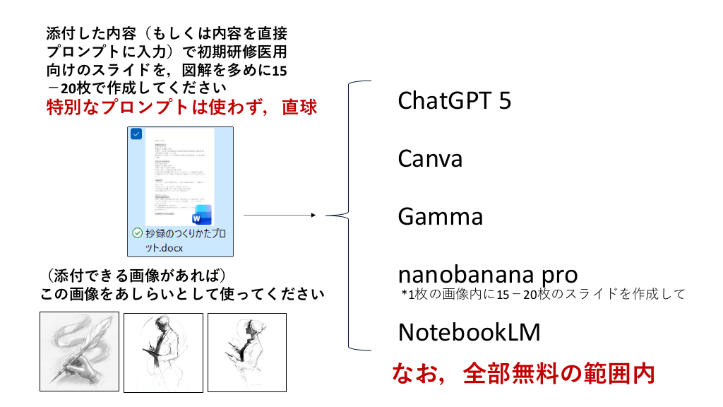 #2. 添付した内容(もしくは内容を直接 プロンプトに入力)で初期研修医用 向けのスライドを,図解を多めに15 -20枚で作成してください 特別なプロンプトは使わず,直球 ChatGPT 5 Canva Gamma (添付できる画像があれば) この画像をあしらいとして使ってください nanobanana pro *1枚の画像内に15-20枚のスライドを作成して NotebookLM なお,全部無料の範囲内