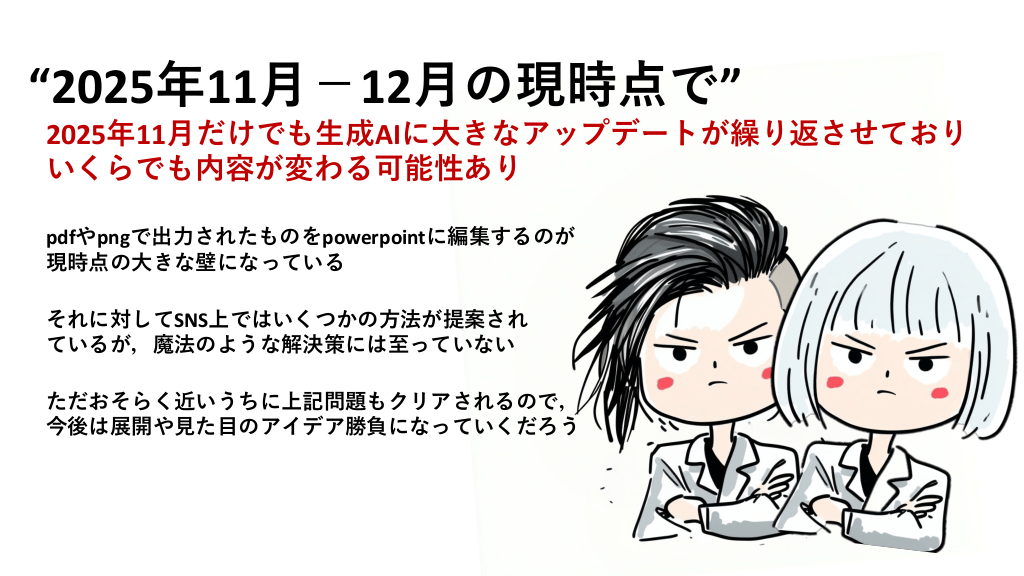 #25. “2025年11月-12月の現時点で” 2025年11月だけでも生成AIに大きなアップデートが繰り返させており いくらでも内容が変わる可能性あり pdfやpngで出力されたものをpowerpointに編集するのが 現時点の大きな壁になっている それに対してSNS上ではいくつかの方法が提案され ているが,魔法のような解決策には至っていない ただおそらく近いうちに上記問題もクリアされるので, 今後は展開や見た目のアイデア勝負になっていくだろう