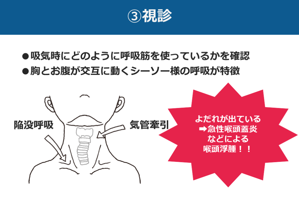 ●胸とお腹が交互に動くシーソー様の呼吸が特徴 気管牽引 陥没呼吸 よだれが出ている