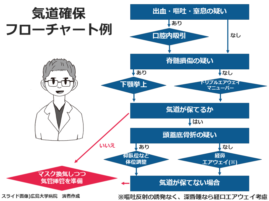 フローチャート例 出血・嘔吐・窒息の疑い 脊髄損傷の疑い 気道が保てるか 気道が保てない場合 口腔内吸引 下顎挙上 トリプルエアウェイマニューバー 頭蓋底骨折の疑い 仰臥位など体位調整 マスク換気しつつ