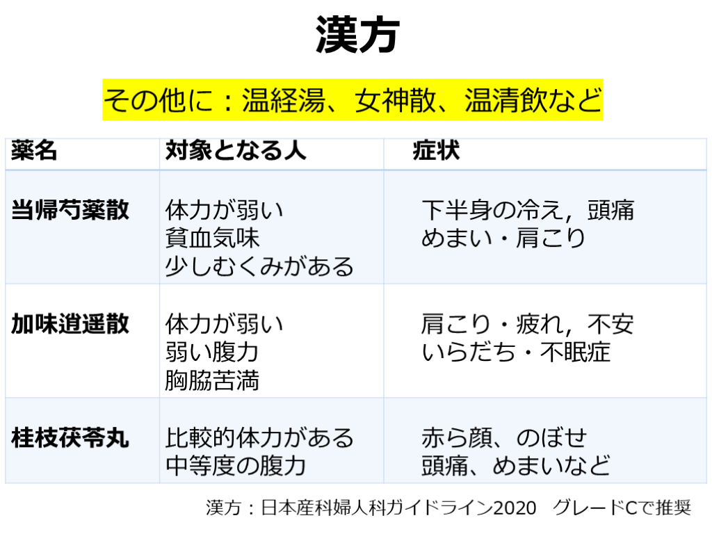 #16. 漢方 漢方:日本産科婦人科ガイドライン2020 グレードCで推奨 その他に:温経湯、女神散、温清飲など
