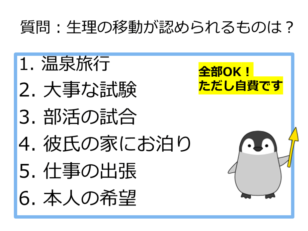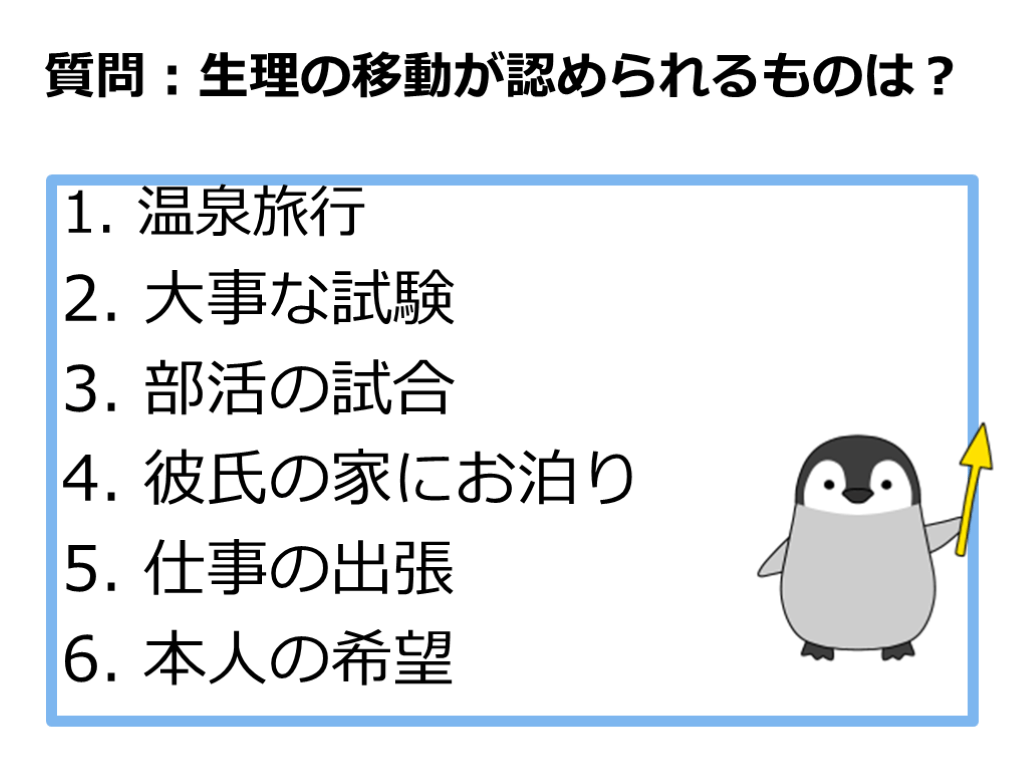 #30. 質問:生理の移動が認められるものは? 温泉旅行