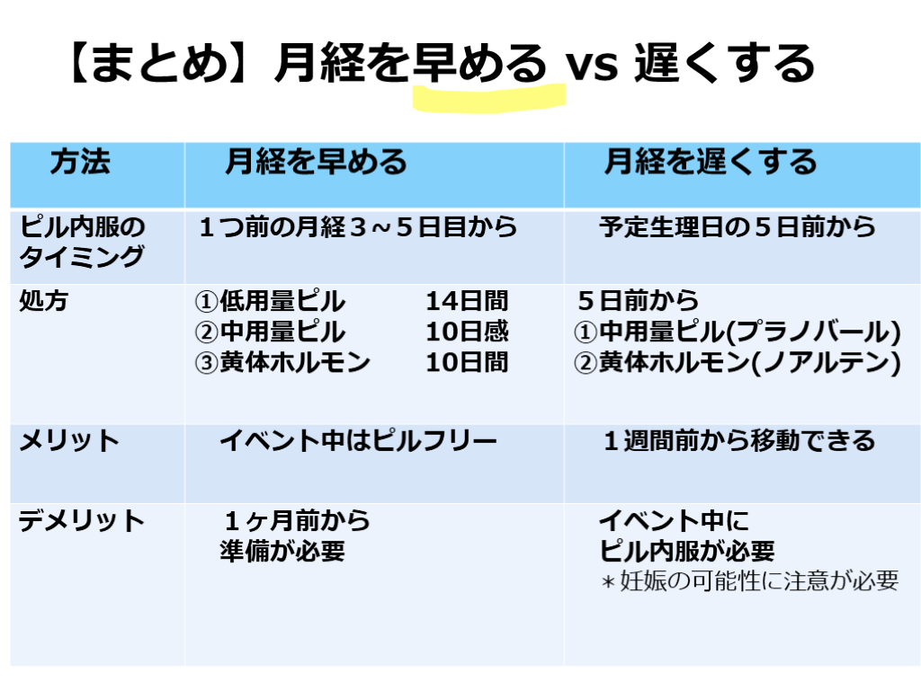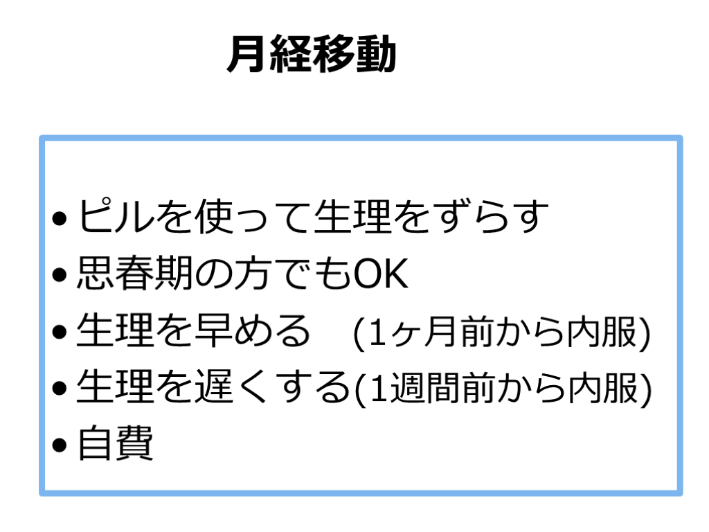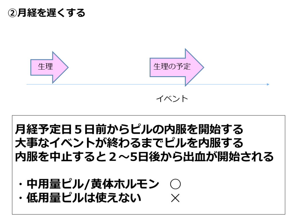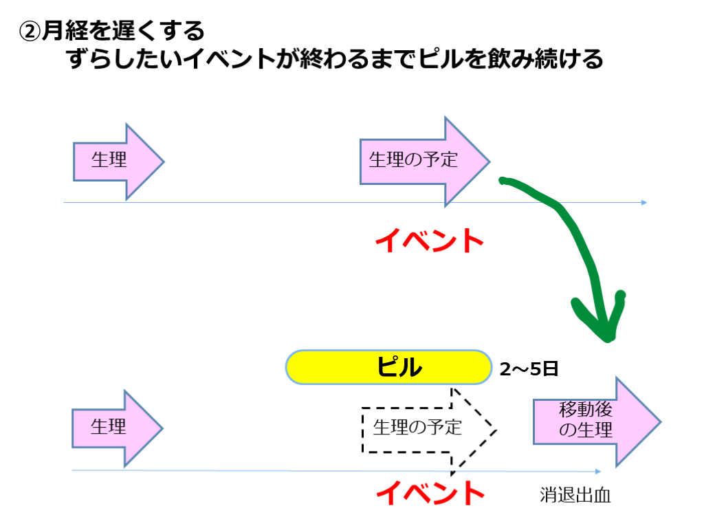ずらしたいイベントが終わるまでピルを飲み続ける 生理 生理の予定 ピル イベント 生理 生理の予定 移動後