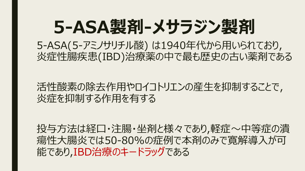 #12. 5-ASA製剤-メサラジン製剤 5-ASA(5-アミノサリチル酸) は1940年代から⽤いられており, 炎症性腸疾患(IBD)治療薬の中で最も歴史の古い薬剤である 活性酸素の除去作⽤やロイコトリエンの産⽣を抑制することで, 炎症を抑制する作⽤を有する 投与⽅法は経⼝・注腸・坐剤と様々であり,軽症〜中等症の潰 瘍性⼤腸炎では50-80%の症例で本剤のみで寛解導⼊が可 能であり,IBD治療のキードラッグである