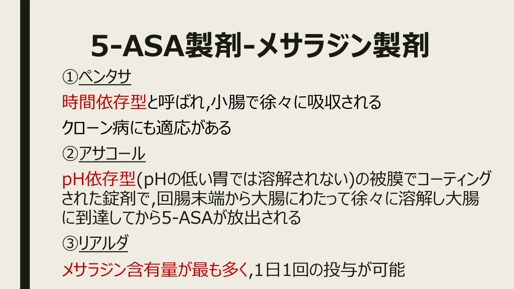 #13. 5-ASA製剤-メサラジン製剤 ①ペンタサ 時間依存型と呼ばれ,⼩腸で徐々に吸収される クローン病にも適応がある ②アサコール pH依存型(pHの低い胃では溶解されない)の被膜でコーティング された錠剤で,回腸末端から⼤腸にわたって徐々に溶解し⼤腸 に到達してから5-ASAが放出される ③リアルダ メサラジン含有量が最も多く,1⽇1回の投与が可能