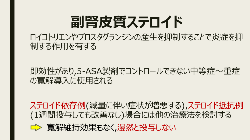#14. 副腎⽪質ステロイド ロイコトリエンやプロスタグランジンの産⽣を抑制することで炎症を抑 制する作⽤を有する 即効性があり,5-ASA製剤でコントロールできない中等症〜重症 の寛解導⼊に使⽤される ステロイド依存例(減量に伴い症状が増悪する),ステロイド抵抗例 (1週間投与しても改善なし)場合には他の治療法を検討する 寛解維持効果もなく,漫然と投与しない