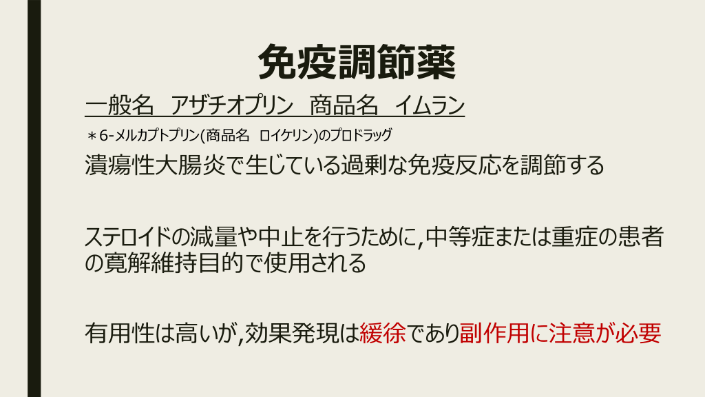 #15. 免疫調節薬 ⼀般名 アザチオプリン 商品名 イムラン *6-メルカプトプリン(商品名 ロイケリン)のプロドラッグ 潰瘍性⼤腸炎で⽣じている過剰な免疫反応を調節する ステロイドの減量や中⽌を⾏うために,中等症または重症の患者 の寛解維持⽬的で使⽤される 有⽤性は⾼いが,効果発現は緩徐であり副作⽤に注意が必要