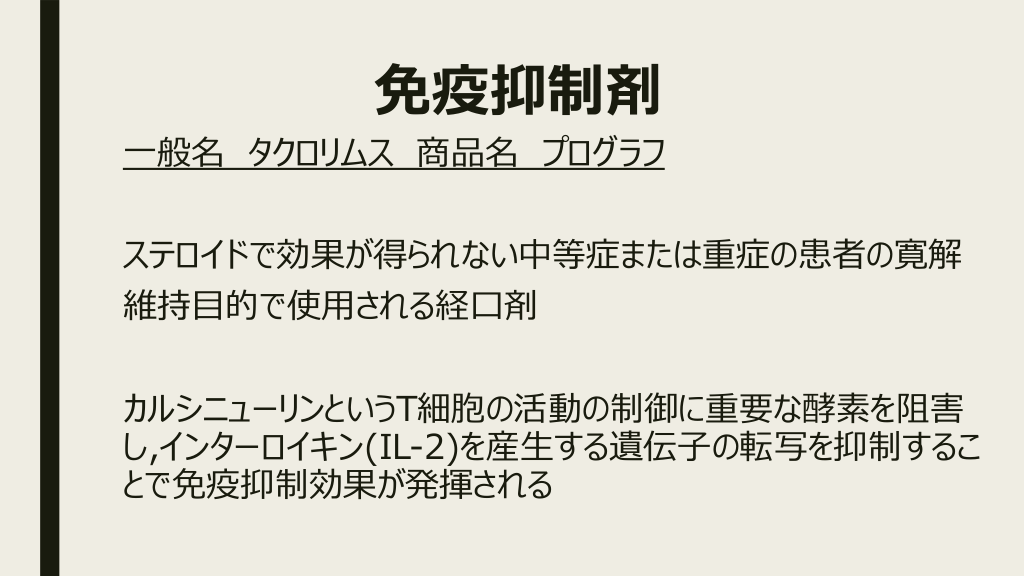 #16. 免疫抑制剤 ⼀般名 タクロリムス 商品名 プログラフ ステロイドで効果が得られない中等症または重症の患者の寛解 維持⽬的で使⽤される経⼝剤 カルシニューリンというT細胞の活動の制御に重要な酵素を阻害 し,インターロイキン(IL-2)を産⽣する遺伝⼦の転写を抑制するこ とで免疫抑制効果が発揮される