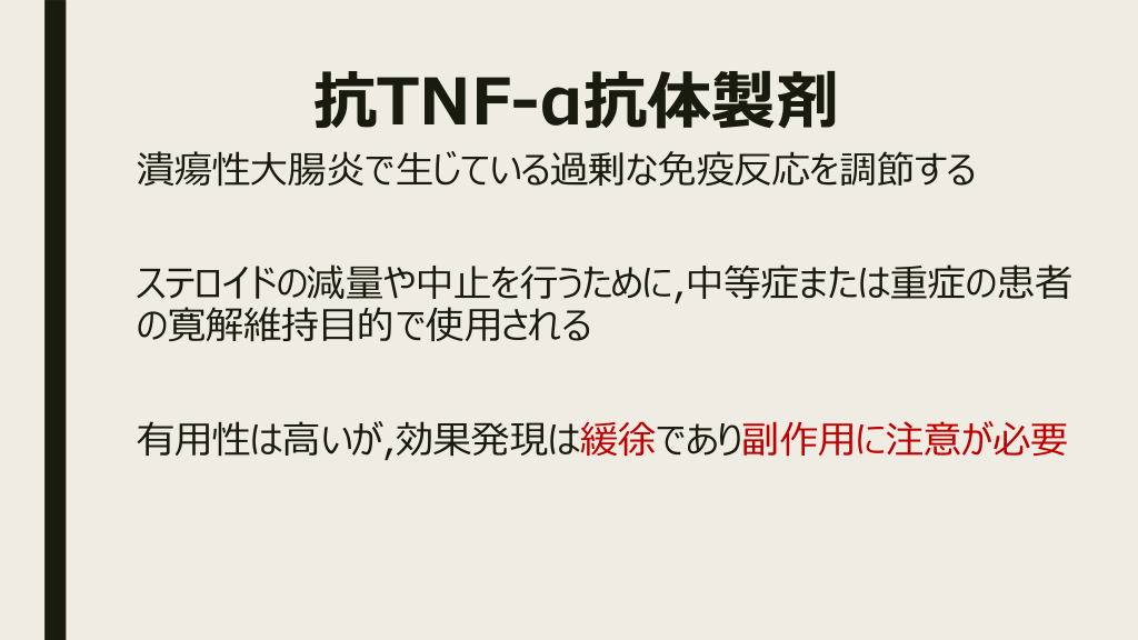 #18. 抗TNF-α抗体製剤 潰瘍性⼤腸炎で⽣じている過剰な免疫反応を調節する ステロイドの減量や中⽌を⾏うために,中等症または重症の患者 の寛解維持⽬的で使⽤される 有⽤性は⾼いが,効果発現は緩徐であり副作⽤に注意が必要