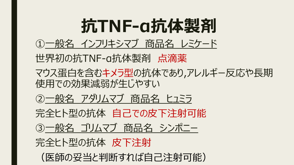 #19. 抗TNF-α抗体製剤 ①⼀般名 インフリキシマブ 商品名 レミケード 世界初の抗TNF-α抗体製剤 点滴薬 マウス蛋⽩を含むキメラ型の抗体であり,アレルギー反応や⻑期 使⽤での効果減弱が⽣じやすい ②⼀般名 アダリムマブ 商品名 ヒュミラ 完全ヒト型の抗体 ⾃⼰での⽪下注射可能 ③⼀般名 ゴリムマブ 商品名 シンポニー 完全ヒト型の抗体 ⽪下注射 (医師の妥当と判断すれば⾃⼰注射可能)