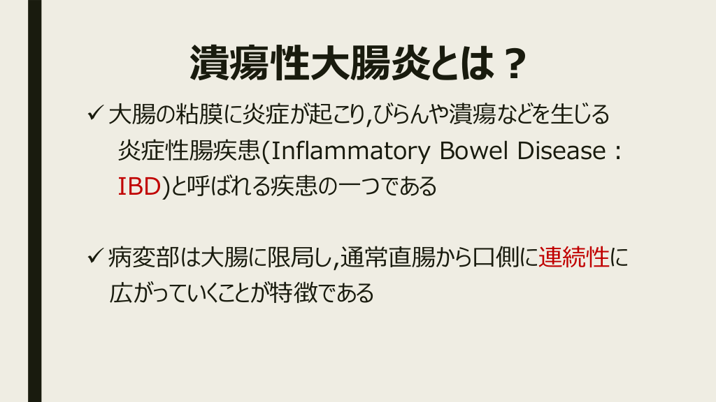 #2. 潰瘍性⼤腸炎とは︖ ü ⼤腸の粘膜に炎症が起こり,びらんや潰瘍などを⽣じる 炎症性腸疾患(Inflammatory Bowel Disease︓ IBD)と呼ばれる疾患の⼀つである ü 病変部は⼤腸に限局し,通常直腸から⼝側に連続性に 広がっていくことが特徴である