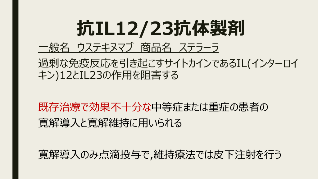 #20. 抗IL12/23抗体製剤 ⼀般名 ウステキヌマブ 商品名 ステラーラ 過剰な免疫反応を引き起こすサイトカインであるIL(インターロイ キン)12とIL23の作⽤を阻害する 既存治療で効果不⼗分な中等症または重症の患者の 寛解導⼊と寛解維持に⽤いられる 寛解導⼊のみ点滴投与で,維持療法では⽪下注射を⾏う