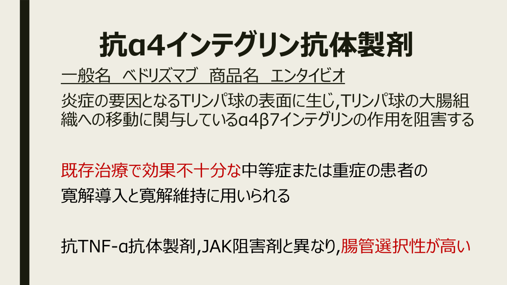 #21. 抗α4インテグリン抗体製剤 ⼀般名 ベドリズマブ 商品名 エンタイビオ 炎症の要因となるTリンパ球の表⾯に⽣じ,Tリンパ球の⼤腸組 織への移動に関与しているα4β7インテグリンの作⽤を阻害する 既存治療で効果不⼗分な中等症または重症の患者の 寛解導⼊と寛解維持に⽤いられる 抗TNF-α抗体製剤,JAK阻害剤と異なり,腸管選択性が⾼い