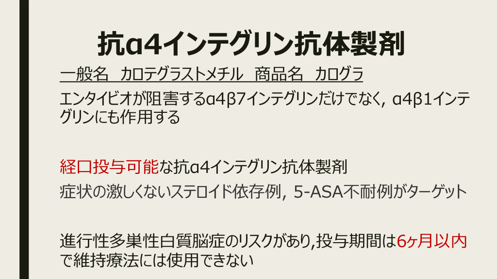 #22. 抗α4インテグリン抗体製剤 ⼀般名 カロテグラストメチル 商品名 カログラ エンタイビオが阻害するα4β7インテグリンだけでなく, α4β1インテ グリンにも作⽤する 経⼝投与可能な抗α4インテグリン抗体製剤 症状の激しくないステロイド依存例, 5-ASA不耐例がターゲット 進⾏性多巣性⽩質脳症のリスクがあり,投与期間は6ヶ⽉以内 で維持療法には使⽤できない