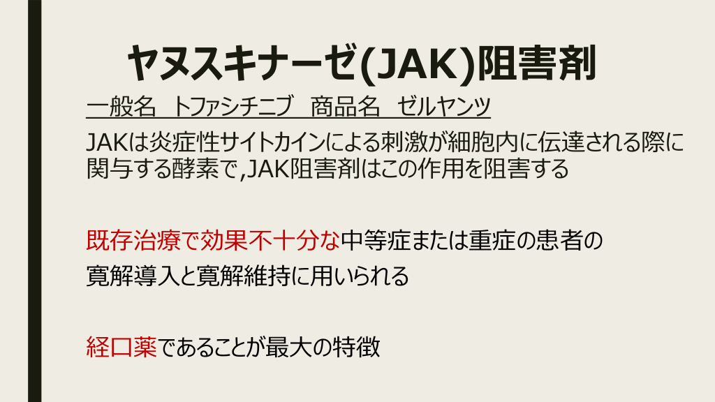 #23. ヤヌスキナーゼ(JAK)阻害剤 ⼀般名 トファシチニブ 商品名 ゼルヤンツ JAKは炎症性サイトカインによる刺激が細胞内に伝達される際に 関与する酵素で,JAK阻害剤はこの作⽤を阻害する 既存治療で効果不⼗分な中等症または重症の患者の 寛解導⼊と寛解維持に⽤いられる 経⼝薬であることが最⼤の特徴
