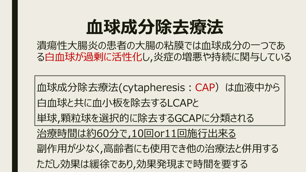 #24. ⾎球成分除去療法 潰瘍性⼤腸炎の患者の⼤腸の粘膜では⾎球成分の⼀つであ る⽩⾎球が過剰に活性化し,炎症の増悪や持続に関与している ⾎球成分除去療法(cytapheresis︓CAP)は⾎液中から ⽩⾎球と共に⾎⼩板を除去するLCAPと 単球,顆粒球を選択的に除去するGCAPに分類される 治療時間は約60分で,10回or11回施⾏出来る 副作⽤が少なく,⾼齢者にも使⽤でき他の治療法と併⽤する ただし効果は緩徐であり,効果発現まで時間を要する