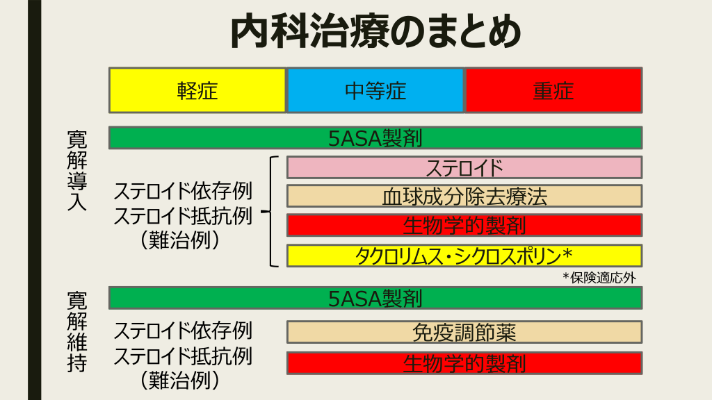 #25. 内科治療のまとめ 軽症 寛 解 導 ⼊ 寛 解 維 持 中等症 重症 5ASA製剤 ステロイド依存例 ステロイド抵抗例 (難治例) ステロイド ⾎球成分除去療法 ⽣物学的製剤 タクロリムス・シクロスポリン* 5ASA製剤 ステロイド依存例 ステロイド抵抗例 (難治例) 免疫調節薬 ⽣物学的製剤 *保険適応外