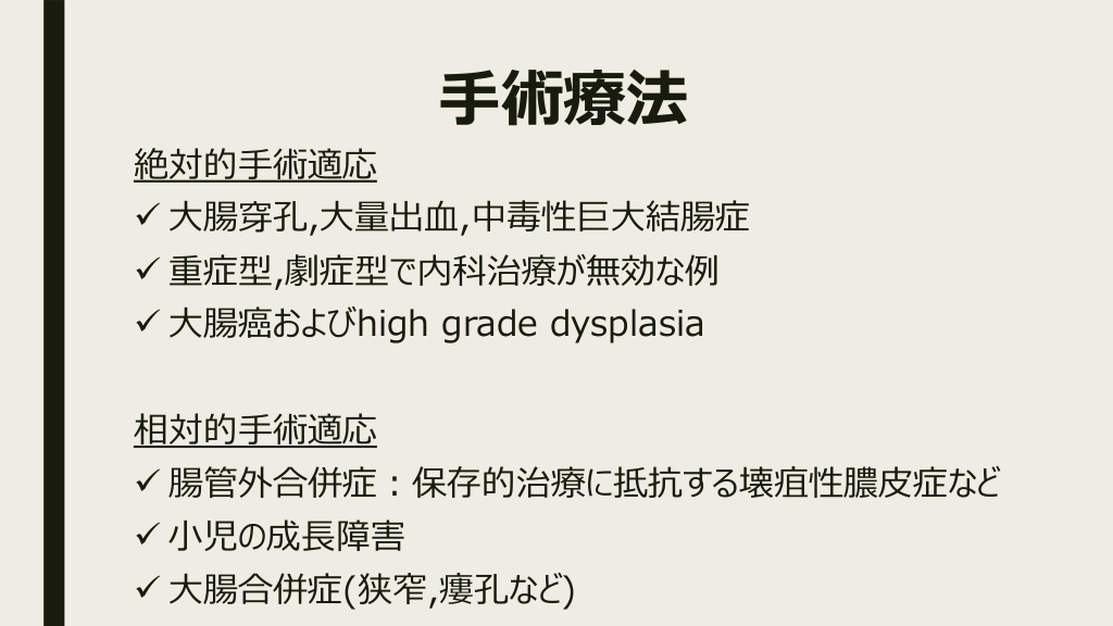 #26. ⼿術療法 絶対的⼿術適応 ü ⼤腸穿孔,⼤量出⾎,中毒性巨⼤結腸症 ü 重症型,劇症型で内科治療が無効な例 ü ⼤腸癌およびhigh grade dysplasia 相対的⼿術適応 ü 腸管外合併症︓保存的治療に抵抗する壊疽性膿⽪症など ü ⼩児の成⻑障害 ü ⼤腸合併症(狭窄,瘻孔など)