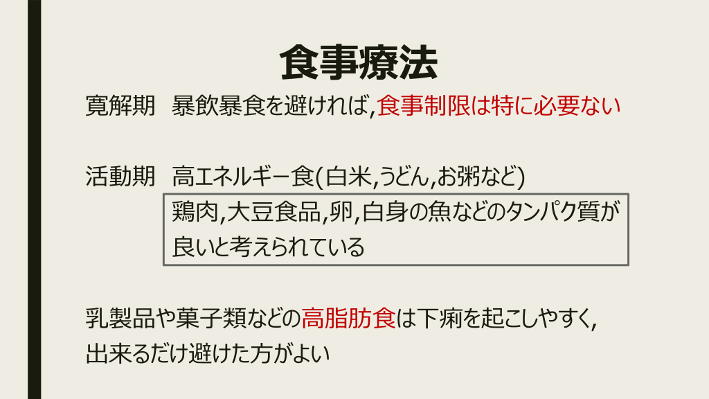 #27. ⾷事療法 寛解期 暴飲暴⾷を避ければ,⾷事制限は特に必要ない 活動期 ⾼エネルギー⾷(⽩⽶,うどん,お粥など) 鶏⾁,⼤⾖⾷品,卵,⽩⾝の⿂などのタンパク質が 良いと考えられている 乳製品や菓⼦類などの⾼脂肪⾷は下痢を起こしやすく, 出来るだけ避けた⽅がよい