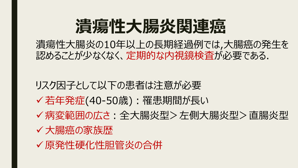 #28. 潰瘍性⼤腸炎関連癌 潰瘍性⼤腸炎の10年以上の⻑期経過例では,⼤腸癌の発⽣を 認めることが少なくなく、定期的な内視鏡検査が必要である. リスク因⼦として以下の患者は注意が必要 ü 若年発症(40-50歳)︓罹患期間が⻑い ü 病変範囲の広さ︓全⼤腸炎型>左側⼤腸炎型>直腸炎型 ü ⼤腸癌の家族歴 ü 原発性硬化性胆管炎の合併