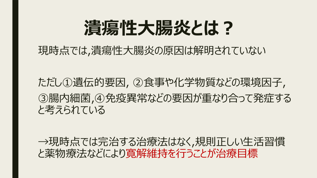 #3. 潰瘍性⼤腸炎とは︖ 現時点では,潰瘍性⼤腸炎の原因は解明されていない ただし①遺伝的要因, ②⾷事や化学物質などの環境因⼦, ③腸内細菌,④免疫異常などの要因が重なり合って発症する と考えられている →現時点では完治する治療法はなく,規則正しい⽣活習慣 と薬物療法などにより寛解維持を⾏うことが治療⽬標