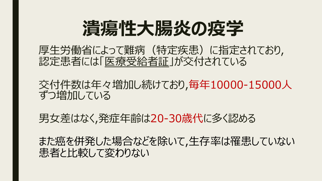 #4. 潰瘍性⼤腸炎の疫学 厚⽣労働省によって難病(特定疾患)に指定されており, 認定患者には「医療受給者証」が交付されている 交付件数は年々増加し続けており,毎年10000-15000⼈ ずつ増加している 男⼥差はなく,発症年齢は20-30歳代に多く認める また癌を併発した場合などを除いて,⽣存率は罹患していない 患者と⽐較して変わりない
