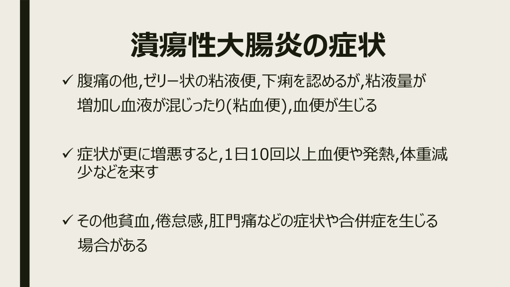 #5. 潰瘍性⼤腸炎の症状 ü 腹痛の他,ゼリー状の粘液便,下痢を認めるが,粘液量が 増加し⾎液が混じったり(粘⾎便),⾎便が⽣じる ü 症状が更に増悪すると,1⽇10回以上⾎便や発熱,体重減 少などを来す ü その他貧⾎,倦怠感,肛⾨痛などの症状や合併症を⽣じる 場合がある