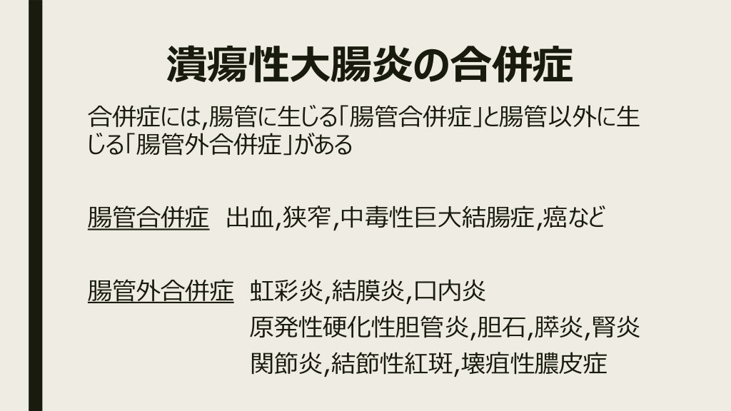 #6. 潰瘍性⼤腸炎の合併症 合併症には,腸管に⽣じる「腸管合併症」と腸管以外に⽣ じる「腸管外合併症」がある 腸管合併症 出⾎,狭窄,中毒性巨⼤結腸症,癌など 腸管外合併症 虹彩炎,結膜炎,⼝内炎 原発性硬化性胆管炎,胆⽯,膵炎,腎炎 関節炎,結節性紅斑,壊疽性膿⽪症