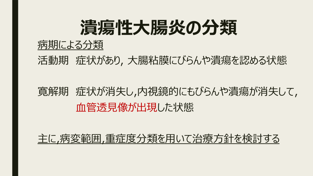 #9. 潰瘍性⼤腸炎の分類 病期による分類 活動期 症状があり, ⼤腸粘膜にびらんや潰瘍を認める状態 寛解期 症状が消失し,内視鏡的にもびらんや潰瘍が消失して, ⾎管透⾒像が出現した状態 主に,病変範囲,重症度分類を⽤いて治療⽅針を検討する