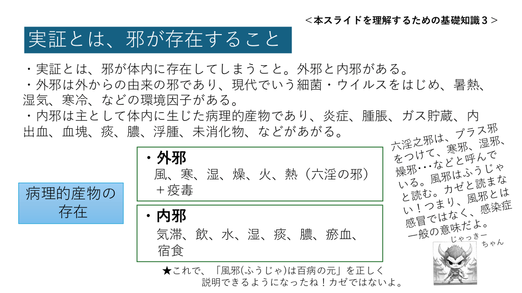 #10. 実証とは、邪が存在すること  <本スライドを理解するための基礎知識3>  ・実証とは、邪が体内に存在してしまうこと。外邪と内邪がある。 ・外邪は外からの由来の邪であり、現代でいう細菌・ウイルスをはじめ、暑熱、 湿気、寒冷、などの環境因子がある。 ・内邪は主として体内に生じた病理的産物であり、炎症、腫脹、ガス貯蔵、内 出血、血塊、痰、膿、浮腫、未消化物、などがあがる。  ・外邪 病理的産物の 存在  風、寒、湿、燥、火、熱(六淫の邪) +疫毒  ・内邪  気滞、飲、水、湿、痰、膿、瘀血、 宿食 ★これで、「風邪(ふうじゃ)は百病の元」を正しく 説明できるようになったね!カゼではないよ。