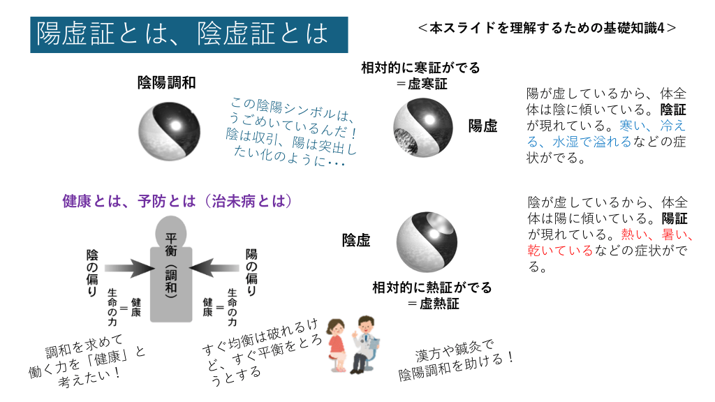#11. 陽虚証とは、陰虚証とは 陰陽調和  <本スライドを理解するための基礎知識4> 相対的に寒証がでる =虚寒証  陽虚  健康とは、予防とは(治未病とは) 陰虚 相対的に熱証がでる =虚熱証  陽が虚しているから、体全 体は陰に傾いている。陰証 が現れている。寒い、冷え る、水湿で溢れるなどの症 状がでる。 陰が虚しているから、体全 体は陽に傾いている。陽証 が現れている。熱い、暑い、 乾いているなどの症状がで る。