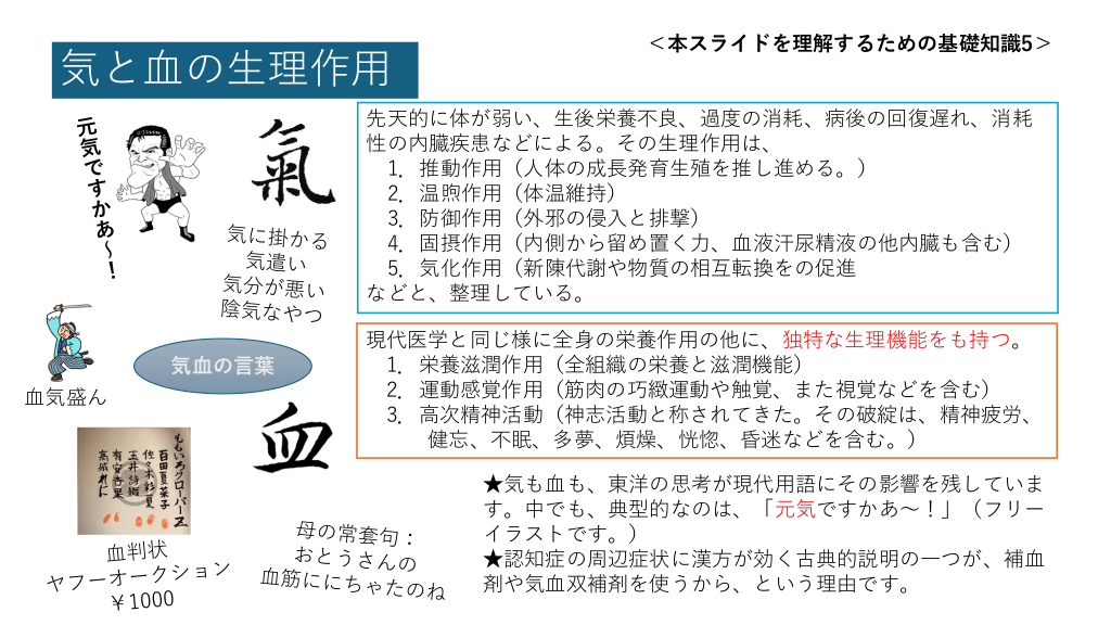 #12. 気と血の生理作用  <本スライドを理解するための基礎知識5>  先天的に体が弱い、生後栄養不良、過度の消耗、病後の回復遅れ、消耗 性の内臓疾患などによる。その生理作用は、 1.推動作用(人体の成長発育生殖を推し進める。) 2.温煦作用(体温維持) 3.防御作用(外邪の侵入と排撃) 4.固摂作用(内側から留め置く力、血液汗尿精液の他内臓も含む) 5.気化作用(新陳代謝や物質の相互転換をの促進 などと、整理している。  血気盛ん  気血の言葉  現代医学と同じ様に全身の栄養作用の他に、独特な生理機能をも持つ。 1.栄養滋潤作用(全組織の栄養と滋潤機能) 2.運動感覚作用(筋肉の巧緻運動や触覚、また視覚などを含む) 3.高次精神活動(神志活動と称されてきた。その破綻は、精神疲労、 健忘、不眠、多夢、煩燥、恍惚、昏迷などを含む。) ★気も血も、東洋の思考が現代用語にその影響を残していま す。中でも、典型的なのは、「元気ですかあ~!」(フリー イラストです。) ★認知症の周辺症状に漢方が効く古典的説明の一つが、補血 剤や気血双補剤を使うから、という理由です。