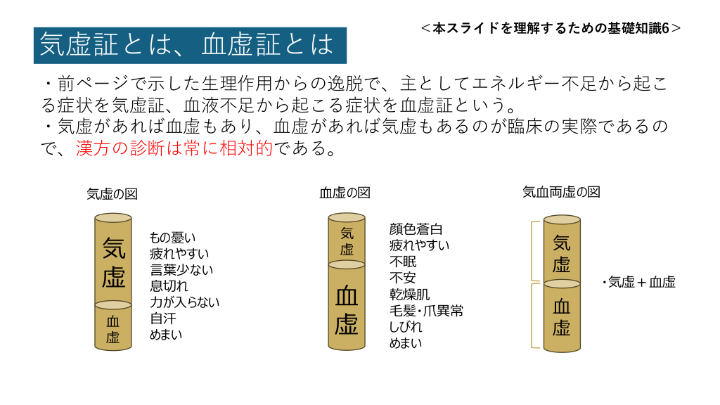 #13. <本スライドを理解するための基礎知識6>  気虚証とは、血虚証とは  ・前ページで示した生理作用からの逸脱で、主としてエネルギー不足から起こ る症状を気虚証、血液不足から起こる症状を血虚証という。 ・気虚があれば血虚もあり、血虚があれば気虚もあるのが臨床の実際であるの で、漢方の診断は常に相対的である。  気 虚 血 虚  気血両虚の図  血虚の図  気虚の図 もの憂い 疲れやすい 言葉少ない 息切れ 力が入らない 自汗 めまい  気 虚  血 虚  顔色蒼白 疲れやすい 不眠 不安 乾燥肌 毛髪・爪異常 しびれ めまい  気 虚 血 虚  ・気虚+血虚