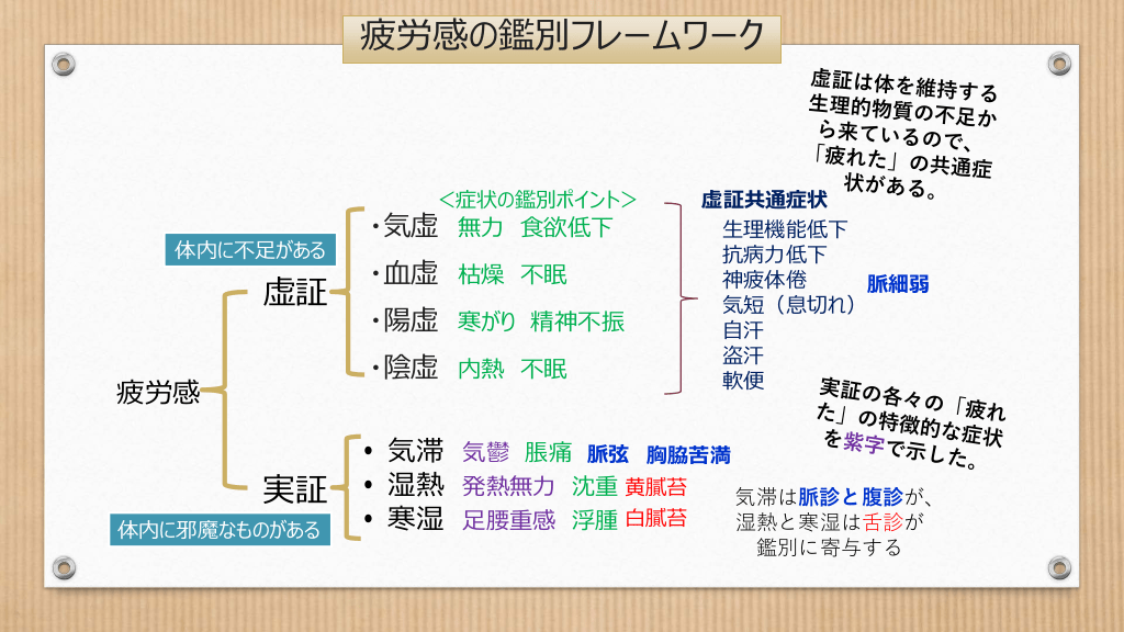 #14. 疲労感の鑑別フレームワーク  <症状の鑑別ポイント>  体内に不足がある  虚証  ・気虚 無力 食欲低下 ・血虚 枯燥 不眠  ・陽虚 寒がり 精神不振 ・陰虚 内熱 不眠  疲労感  実証 体内に邪魔なものがある  虚証共通症状 生理機能低下 抗病力低下 神疲体倦 脈細弱 気短(息切れ) 自汗 盗汗 軟便  • 気滞 気鬱 脹痛 脈弦 胸脇苦満 • 湿熱 発熱無力 沈重 黄膩苔 気滞は脈診と腹診が、 • 寒湿 足腰重感 浮腫 白膩苔 湿熱と寒湿は舌診が 鑑別に寄与する