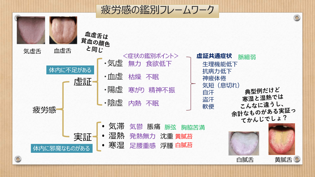 #15. 疲労感の鑑別フレームワーク  気虚舌  血虚舌  <症状の鑑別ポイント>  体内に不足がある  虚証  ・気虚 無力 食欲低下 ・血虚 枯燥 不眠  ・陽虚 寒がり 精神不振 ・陰虚 内熱 不眠  疲労感  実証 体内に邪魔なものがある  虚証共通症状 脈細弱 生理機能低下 抗病力低下 神疲体倦 気短(息切れ) 自汗 盗汗 軟便  • 気滞 気鬱 脹痛 脈弦 胸脇苦満 • 湿熱 発熱無力 沈重 黄膩苔 • 寒湿 足腰重感 浮腫 白膩苔 白膩舌  黄膩舌