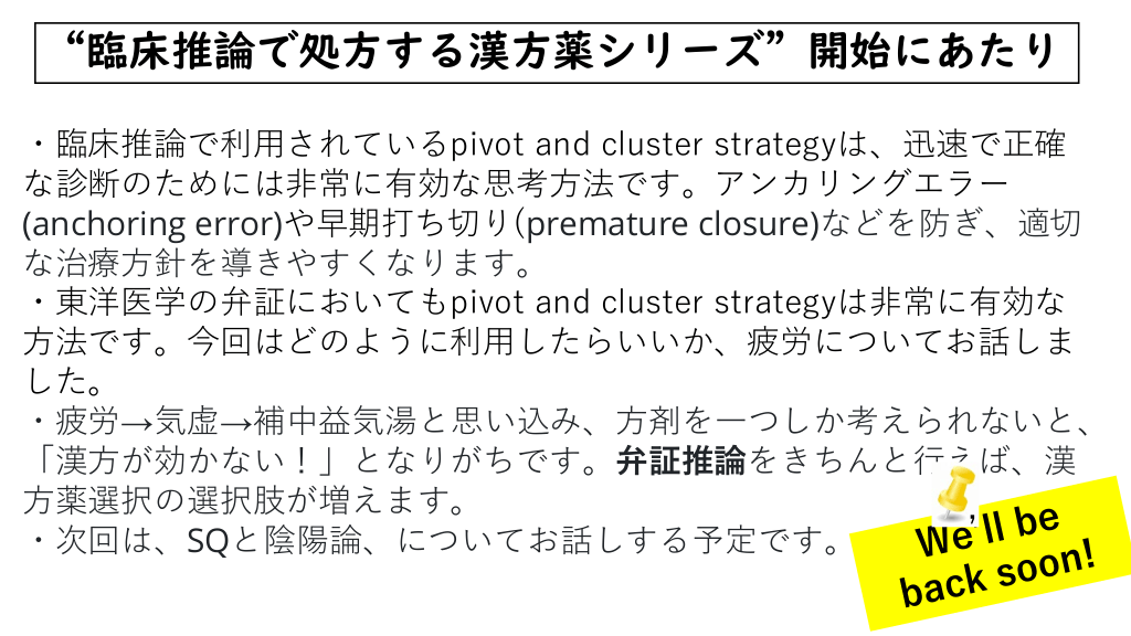 #16. “臨床推論で処方する漢方薬シリーズ”開始にあたり ・臨床推論で利用されているpivot and cluster strategyは、迅速で正確 な診断のためには非常に有効な思考方法です。アンカリングエラー (anchoring error)や早期打ち切り(premature closure)などを防ぎ、適切 な治療方針を導きやすくなります。 ・東洋医学の弁証においてもpivot and cluster strategyは非常に有効な 方法です。今回はどのように利用したらいいか、疲労についてお話しま した。 ・疲労→気虚→補中益気湯と思い込み、方剤を一つしか考えられないと、 「漢方が効かない!」となりがちです。弁証推論をきちんと行えば、漢 方薬選択の選択肢が増えます。 ’ ・次回は、SQと陰陽論、についてお話しする予定です。