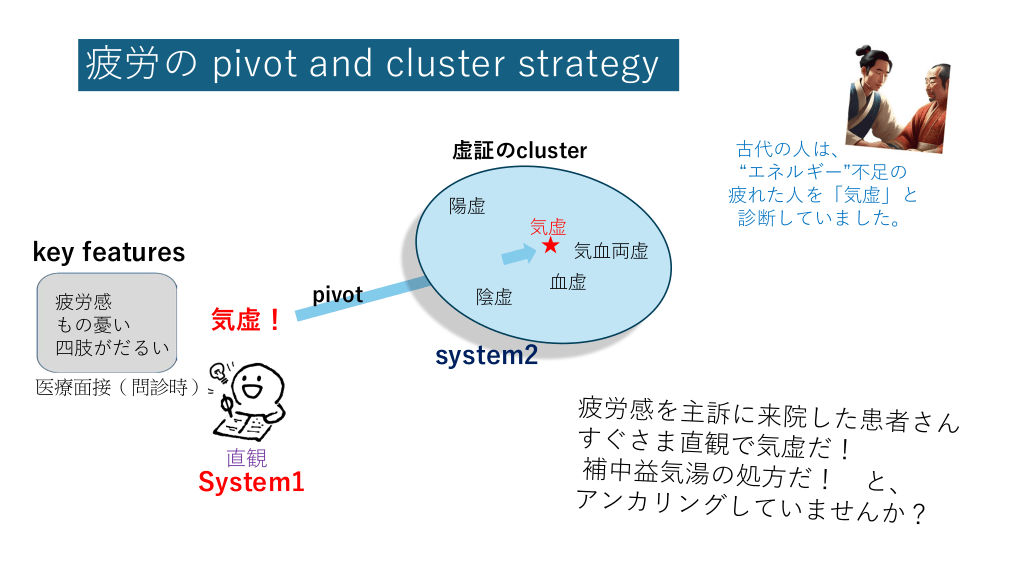 #2. 疲労の pivot and cluster strategy 虚証のcluster 陽虚  key features 疲労感 もの憂い 四肢がだるい  気虚!  医療面接(問診時)  直観  System1  pivot  気虚 ★ 気血両虚  陰虚  system2  血虚  古代の人は、 “エネルギー”不足の 疲れた人を「気虚」と 診断していました。