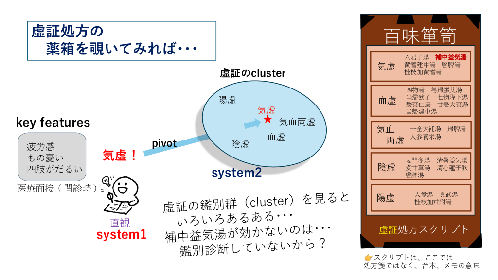 #3. 虚証処方の 薬箱を覗いてみれば・・・  百味箪笥 虚証のcluster 陽虚  key features 疲労感 もの憂い 四肢がだるい  気虚!  医療面接(問診時)  pivot  気虚 ★ 気血両虚  陰虚  system2  血虚  気虚  六君子湯 補中益気湯 黄耆建中湯 啓脾湯 桂枝加黄耆湯  血虚  四物湯 芎帰膠艾湯 当帰飲子 七物降下湯 酸棗仁湯 甘麦大棗湯 当帰建中湯  気血 両虚 陰虚 陽虚  直観  system1  十全大補湯 人参養栄湯  麦門冬湯 炙甘草湯 啓脾湯  帰脾湯  清暑益気湯 清心蓮子飲  人参湯 真武湯 桂枝加朮附湯  虚証処方スクリプト スクリプトは、ここでは 処方箋ではなく、台本、メモの意味