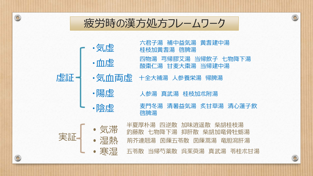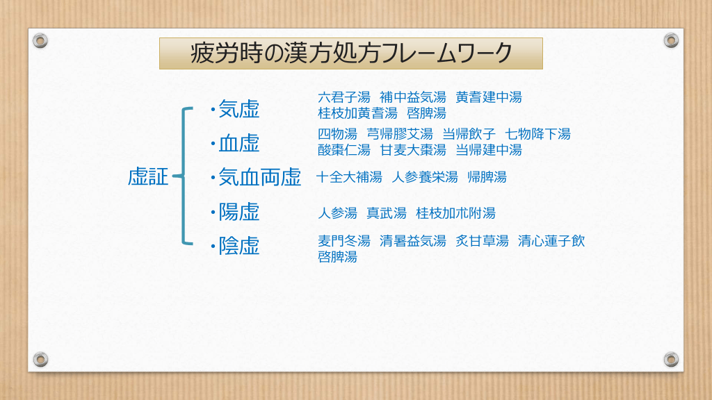 #4. 疲労時の漢方処方フレームワーク ・気虚 虚証  六君子湯 補中益気湯 黄耆建中湯 桂枝加黄耆湯 啓脾湯  ・血虚  四物湯 芎帰膠艾湯 当帰飲子 七物降下湯 酸棗仁湯 甘麦大棗湯 当帰建中湯  ・気血両虚  十全大補湯 人参養栄湯 帰脾湯  ・陽虚  人参湯 真武湯 桂枝加朮附湯  ・陰虚  麦門冬湯 清暑益気湯 炙甘草湯 清心蓮子飲 啓脾湯