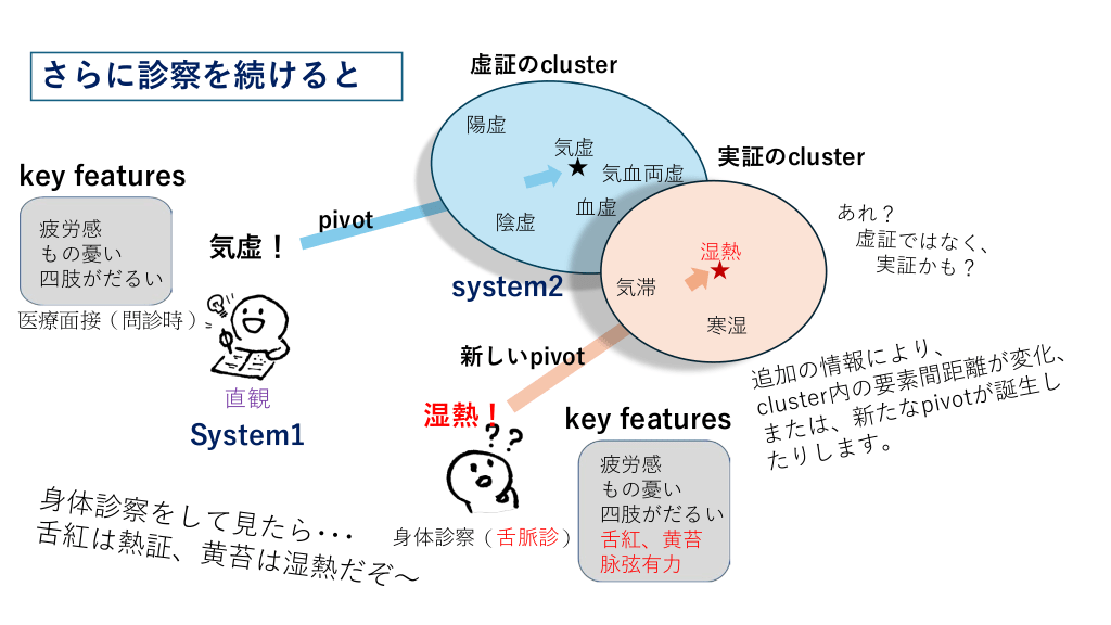 #5. さらに診察を続けると  虚証のcluster 陽虚  key features 疲労感 もの憂い 四肢がだるい  気虚!  pivot  気虚 ★ 気血両虚  陰虚  血虚  system2  気滞  医療面接(問診時)  新しいpivot 直観  System1  湿熱!  実証のcluster  湿熱 ★ 寒湿  key features  疲労感 もの憂い 四肢がだるい 身体診察(舌脈診) 舌紅、黄苔 脉弦有力