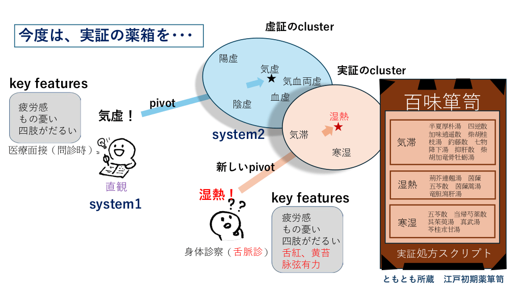 #6. 虚証のcluster  今度は、実証の薬箱を・・・ 陽虚  key features 疲労感 もの憂い 四肢がだるい  気虚!  pivot  気虚 ★ 気血両虚  陰虚  血虚  system2  気滞  医療面接(問診時)  新しいpivot 直観  system1  湿熱!  実証のcluster  湿熱 ★ 寒湿  key features  疲労感 もの憂い 四肢がだるい 身体診察(舌脈診) 舌紅、黄苔 脉弦有力  百味箪笥 気滞  半夏厚朴湯 四逆散 加味逍遥散 柴胡桂 枝湯 釣藤散 七物 降下湯 抑肝散 柴 胡加竜骨牡蛎湯  湿熱  荊芥連翹湯 茵蔯 五苓散 茵蔯蒿湯 竜胆瀉肝湯  寒湿  五苓散 当帰芍薬散 呉茱萸湯 真武湯 苓桂朮甘湯  実証処方スクリプト ともとも所蔵  江戸初期薬箪笥