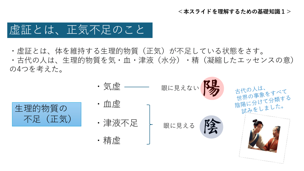 #8. <本スライドを理解するための基礎知識1>  虚証とは、正気不足のこと ・虚証とは、体を維持する生理的物質(正気)が不足している状態をさす。 ・古代の人は、生理的物質を気・血・津液(水分)・精(凝縮したエッセンスの意) の4つを考えた。  ・気虚 生理的物質の 不足(正気)  眼に見えない  ・血虚 ・津液不足 ・精虚  眼に見える