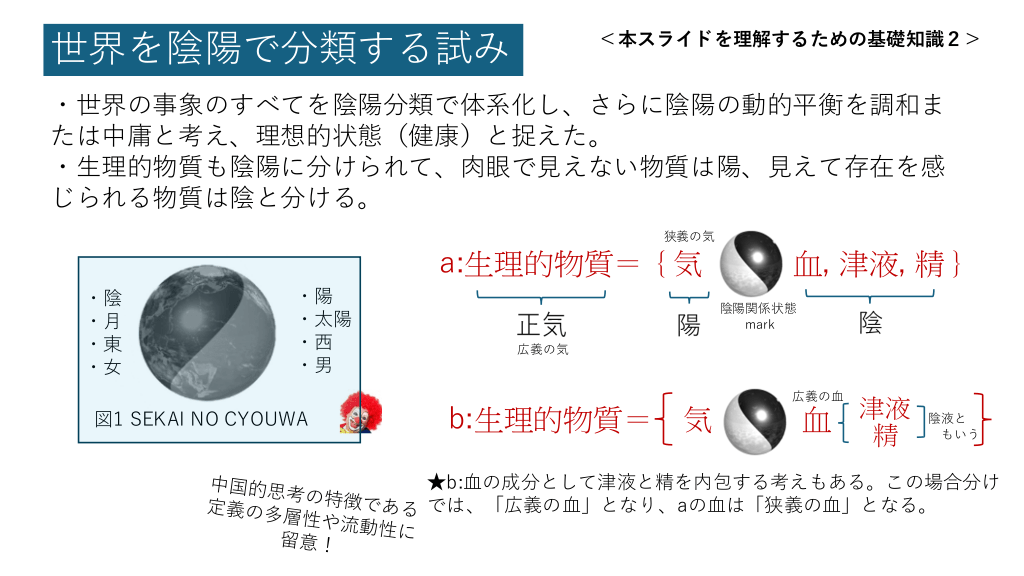 #9. 世界を陰陽で分類する試み  <本スライドを理解するための基礎知識2>  ・世界の事象のすべてを陰陽分類で体系化し、さらに陰陽の動的平衡を調和ま たは中庸と考え、理想的状態(健康)と捉えた。 ・生理的物質も陰陽に分けられて、肉眼で見えない物質は陽、見えて存在を感 じられる物質は陰と分ける。 狭義の気  ・陰 ・月 ・東 ・女  ・陽 ・太陽 ・西 ・男  図1 SEKAI NO CYOUWA  a:生理的物質={気  血, 津液, 精} 陰陽関係状態 mark  広義の気  b:生理的物質=  広義の血  気  血 津液 精  陰液と もいう  ★b:血の成分として津液と精を内包する考えもある。この場合分け では、「広義の血」となり、aの血は「狭義の血」となる。