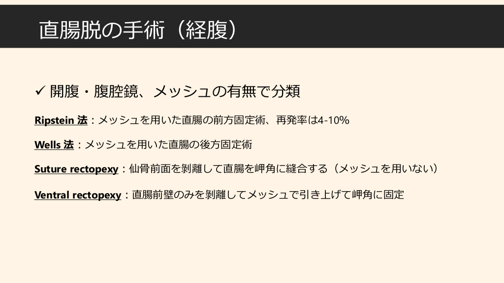 #10. 直腸脱の手術(経腹) ✓ 開腹・腹腔鏡、メッシュの有無で分類 Ripstein 法:メッシュを用いた直腸の前方固定術、再発率は4-10% Wells 法:メッシュを用いた直腸の後方固定術 Suture rectopexy:仙骨前面を剝離して直腸を岬角に縫合する(メッシュを用いない) Ventral rectopexy:直腸前壁のみを剝離してメッシュで引き上げて岬角に固定