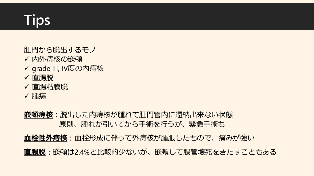 #11. Tips 肛門から脱出するモノ ✓ 内外痔核の嵌頓 ✓ grade III, IV度の内痔核 ✓ 直腸脱 ✓ 直腸粘膜脱 ✓ 腫瘍 嵌頓痔核:脱出した内痔核が腫れて肛門管内に還納出来ない状態 原則、腫れが引いてから手術を行うが、緊急手術も 血栓性外痔核:血栓形成に伴って外痔核が腫脹したもので、痛みが強い 直腸脱:嵌頓は2.4%と比較的少ないが、嵌頓して腸管壊死をきたすこともある